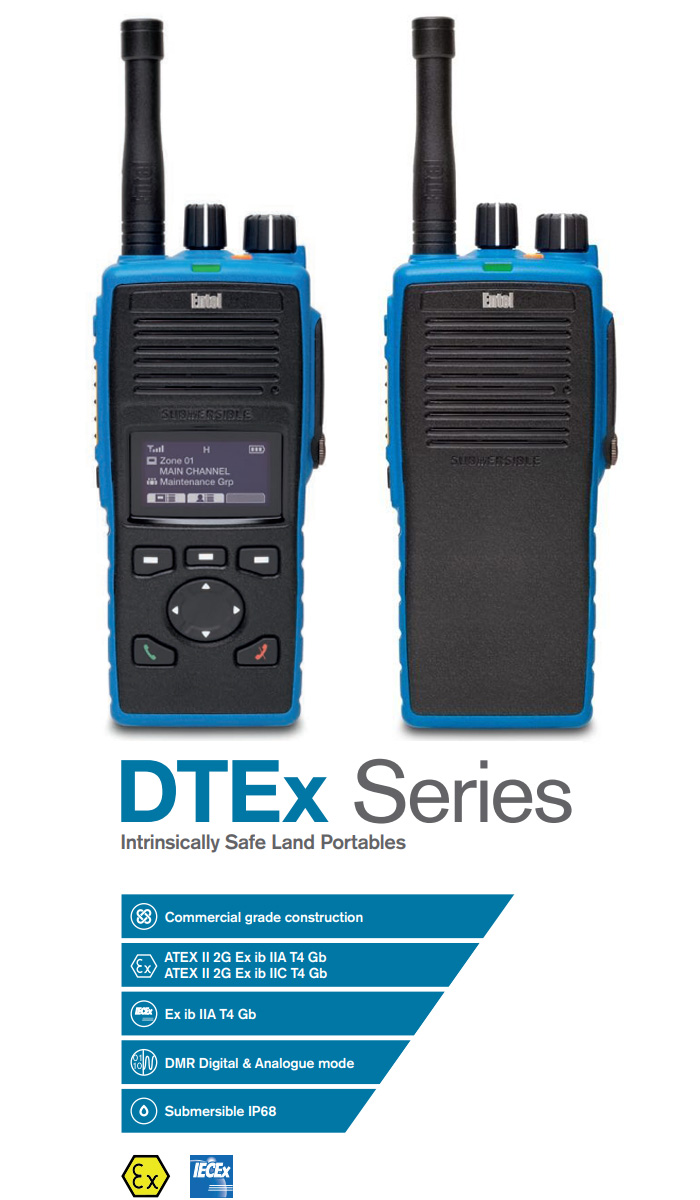 Designed by Entel’s UK-based research and development team to withstand the most extreme and hostile of environments. The Intrinsically Safe, fully-featured DTEx DMR Digital Series handsets, deliver best in class range, safety and reliability coupled with loud and clear audio.